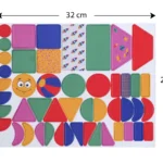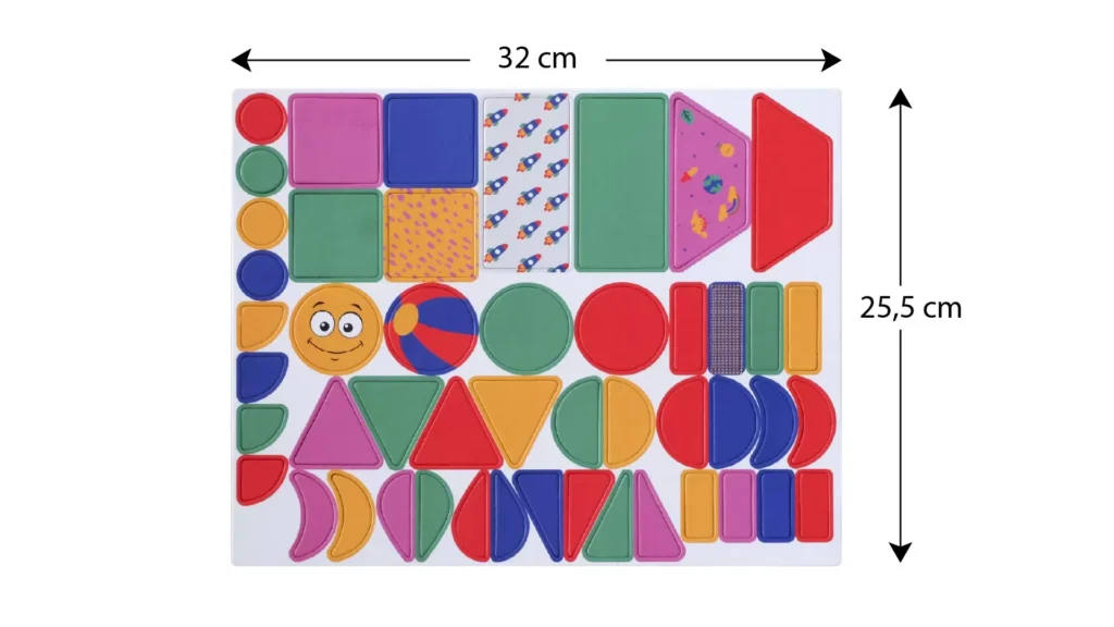 - Viele Formen - ein Set von 48 magnetischen Elementen in verschiedenen geometrischen Formen: Kreis, Dreieck, Quadrat, Rechteck, Halbkreis, Halbmond, Tropfen, Viertelkreis.
