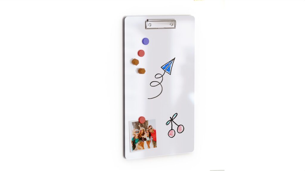 Die Oberfläche der Tafel besteht aus strapazierfähigem, weiß lackiertem Blech mit magnetischen und trocken abwischbaren Eigenschaften. Es ist leicht zu reinigen, glatt und glänzend.