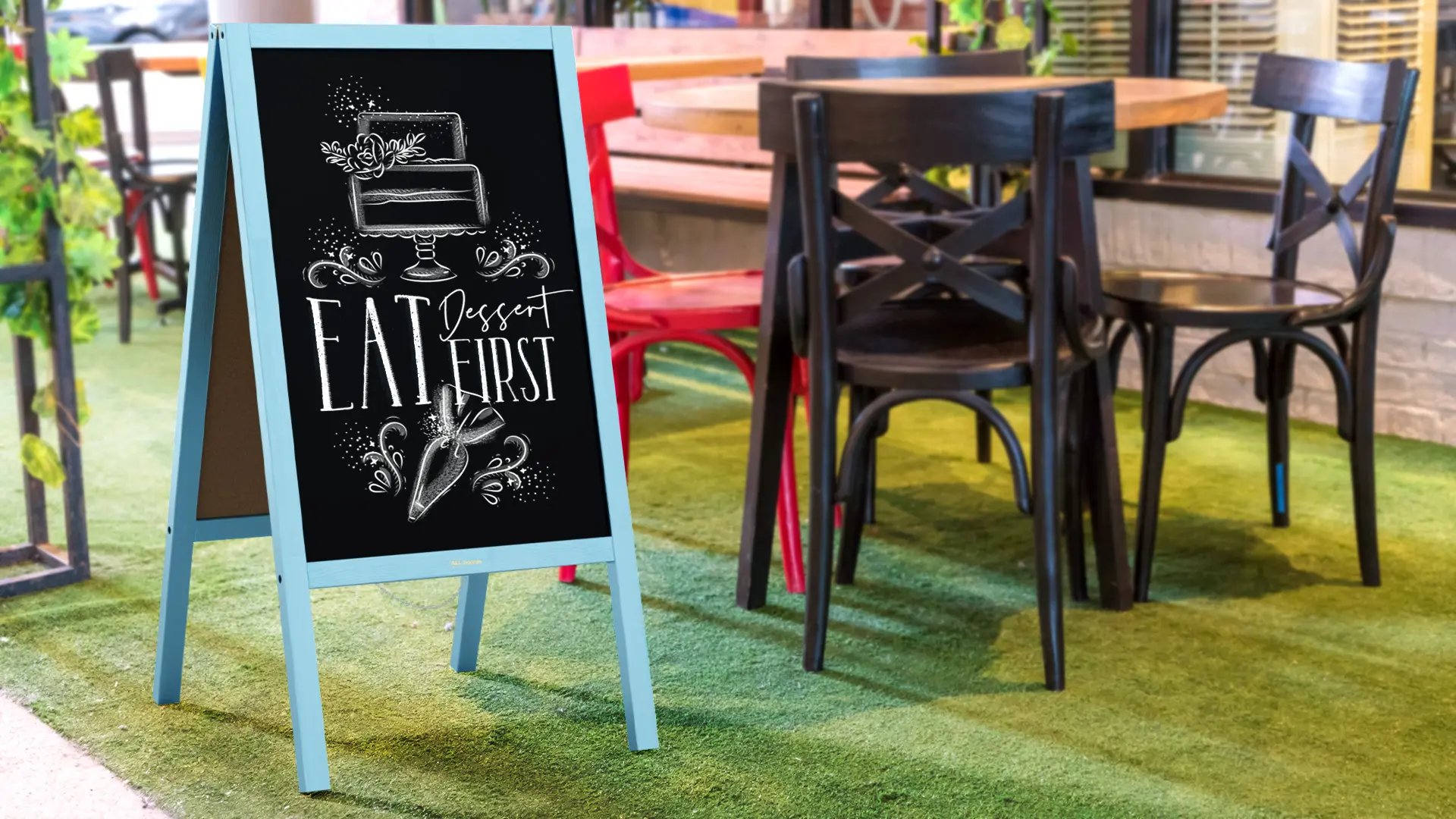 Kundenstopper mit blauem Holzrahmen 118x61cm, Werbetafel, Gehwegaufsteller, Aufsteller, Straßenreiter, Kreide