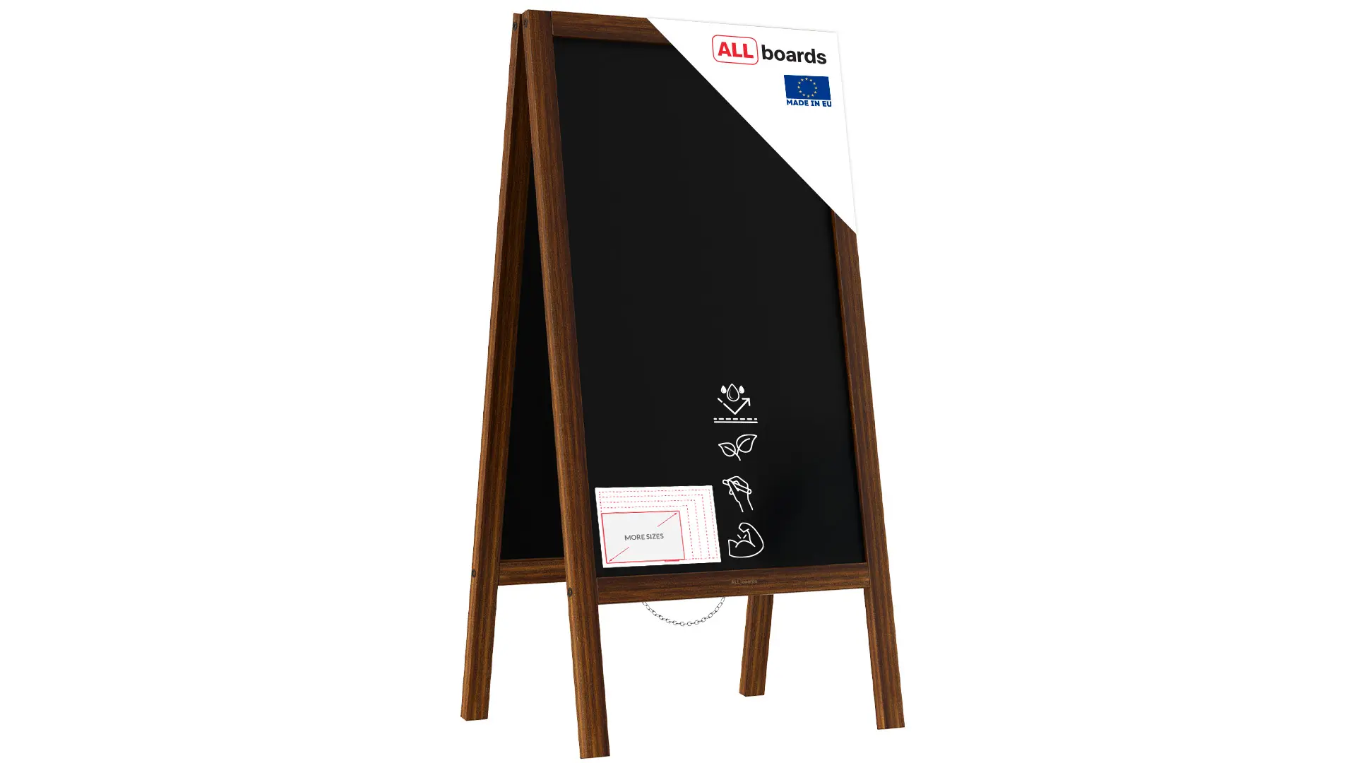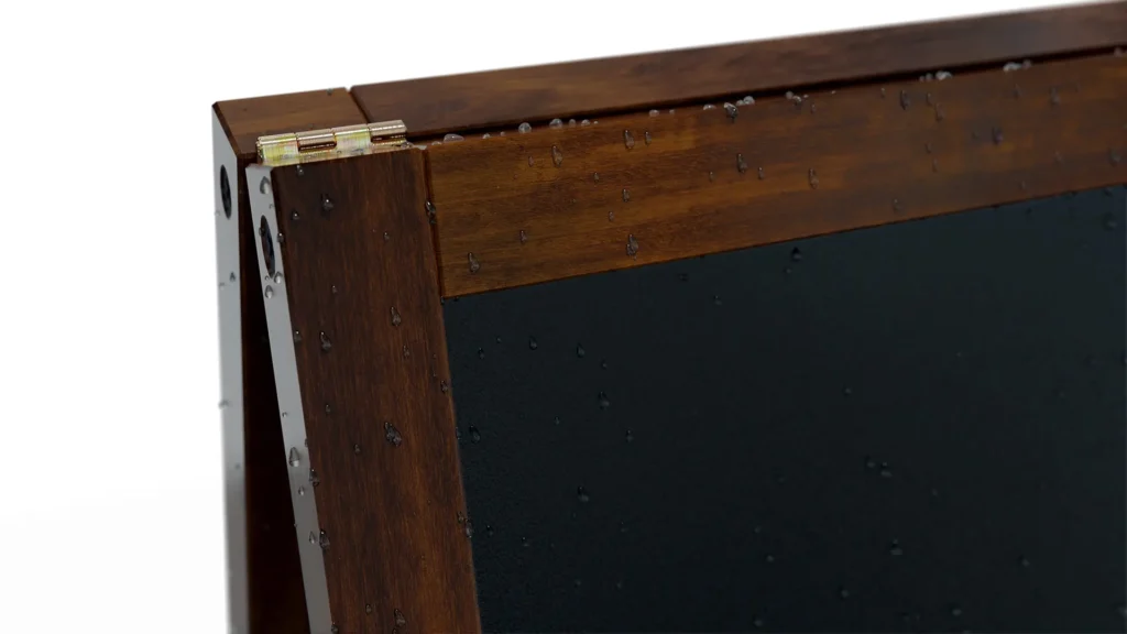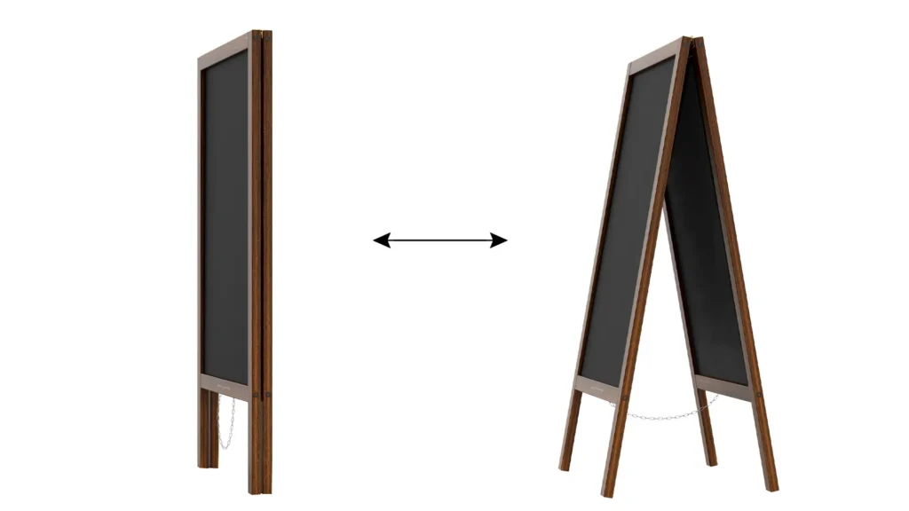 Die beidseitig beschreibbare, kratzfeste und wasserfeste Tafeloberfläche wurde aus schwarz lackierter und stabiler ABS-Faserplatte hergestellt. Diese wurde außerdem kontinuierlich mit Lack beschichtet, der somit den richtigen Kontrast herstellt und dadurch verhindert, dass der Kreidestaub in die Oberfläche eindringt. Kreidemarker lassen sich ebenfalls problemlos mit einem angefeuchteten Tuch oder einem Schwamm abwischen. Die Tafeloberfläche ist kratzfest und eignet sich sehr gut zum Beschriften mit Kreide oder Kreidemarkern. Dank der stabilen und wetterfesten Oberfläche eignet sich die Werbetafel optimal für den Außenbereich.