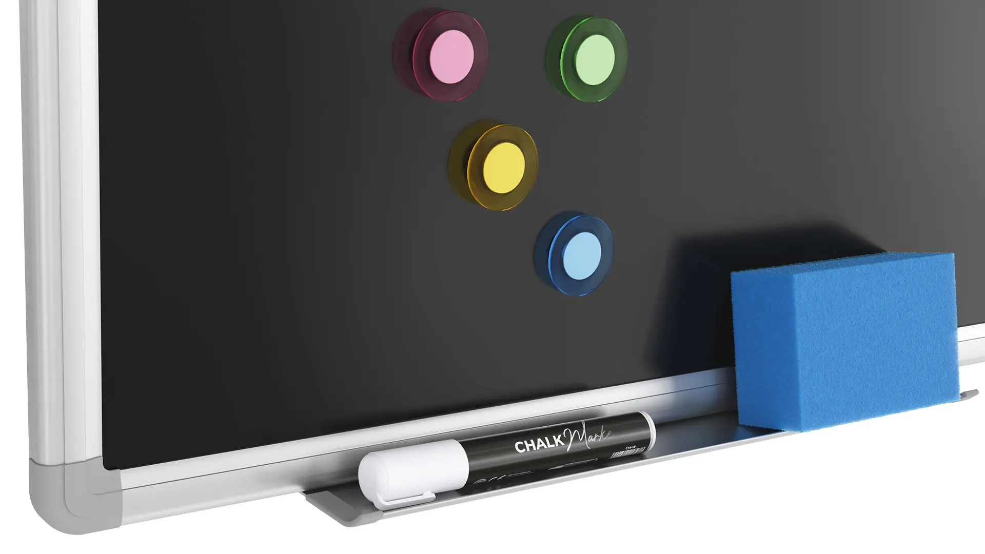 Die beschreibbare, kratzfeste Tafeloberfläche wurde aus schwarz lackierter und hochdichter HDF-Faserplatte hergestellt. Diese wurde außerdem kontinuierlich mit Lack beschichtet, der somit den richtigen Kontrast herstellt und dadurch verhindert, dass der Kreidestaub in die Oberfläche eindringt. Kreidemarker lassen sich ebenfalls problemlos mit einem angefeuchteten Tuch oder einem Schwamm abwischen. Die Tafeloberfläche ist kratzfest und eignet sich sehr gut zum Beschriften mit Kreide oder Kreidemarkern. Mit Magneten können dagegen sämtliche Zettel und andere wichtige Unterlagen an der Tafel befestigt werden.
