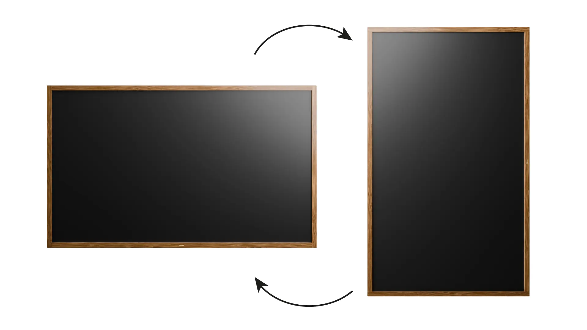 Der Rahmen ist leicht und biegsam. Er wurde aus Kiefernholz hergestellt und braun lackiert. Die Tafel kann je nach Bedarf vertikal oder horizontal mit Hilfe eines im Rahmen verdeckten Montagesystems befestigt werden