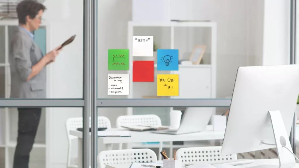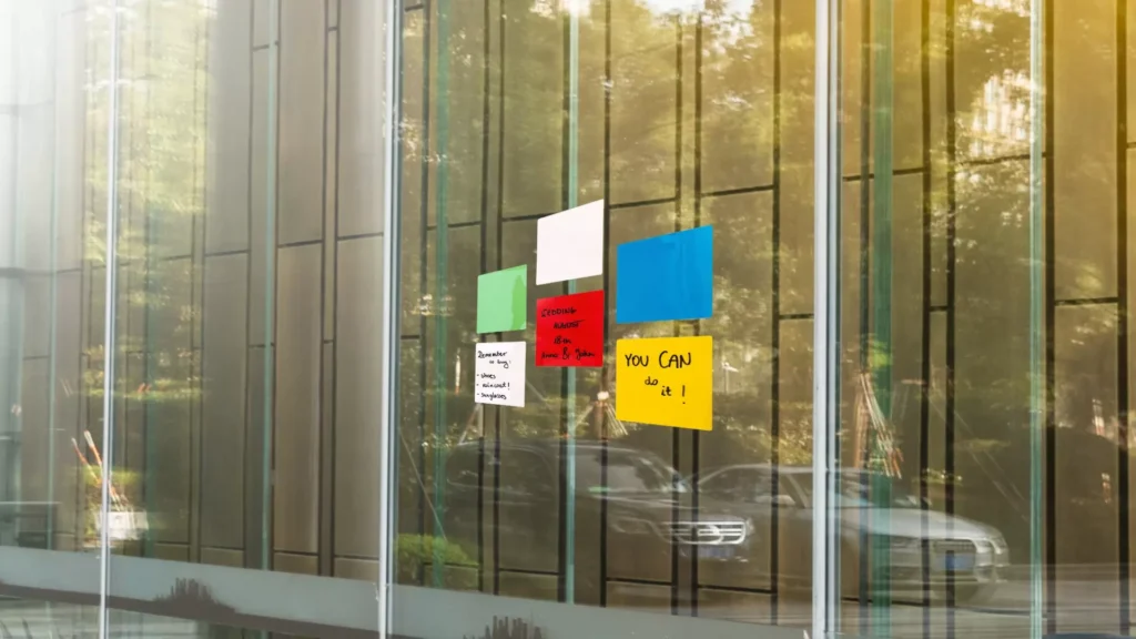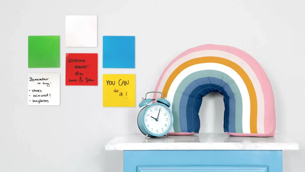 Selbstklebende, elektrostatische, trocken abwischbare Notizzetteln, Sticky Notes – STANDARD-Set (5 Farben), wiederverwendbar