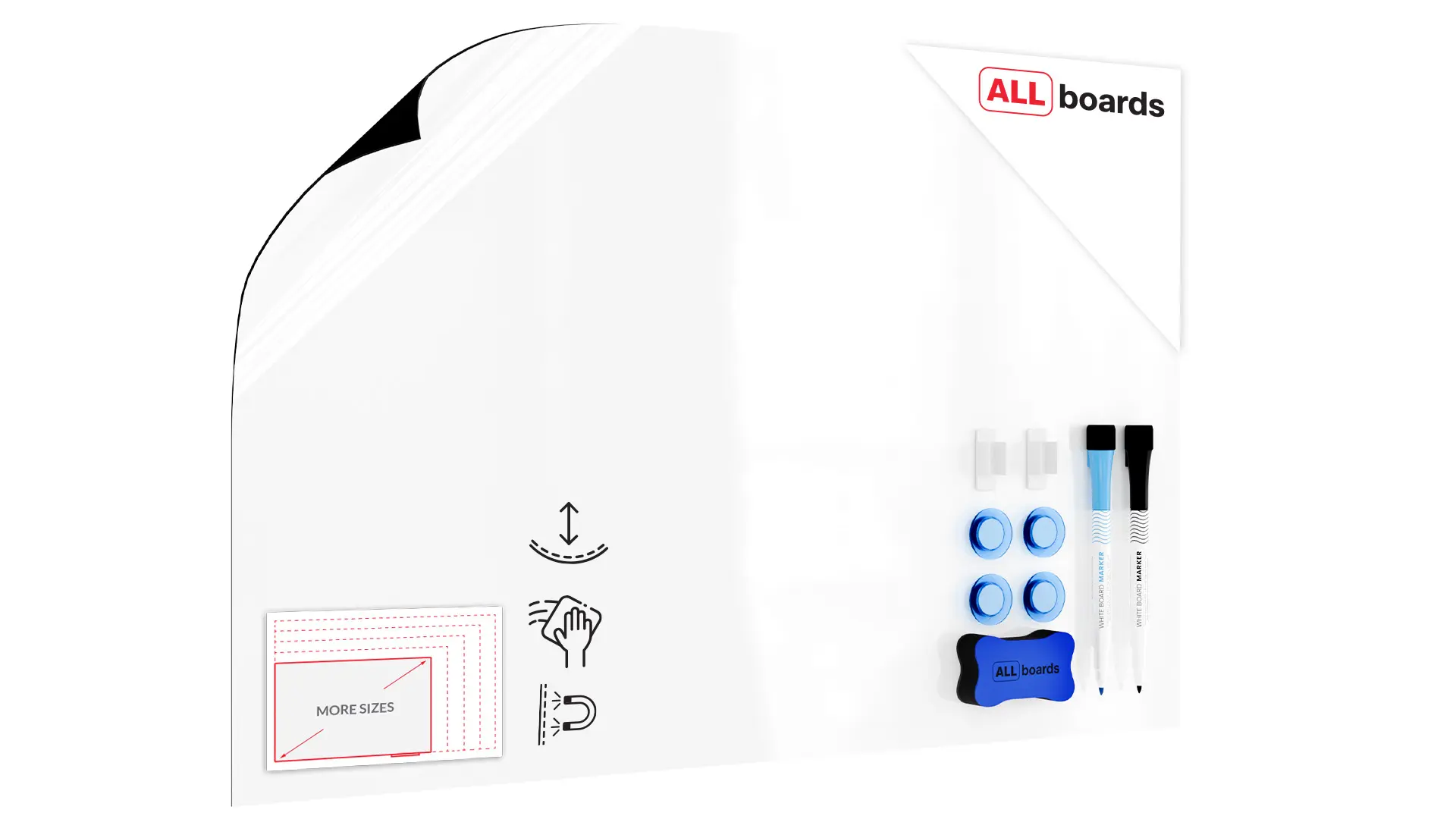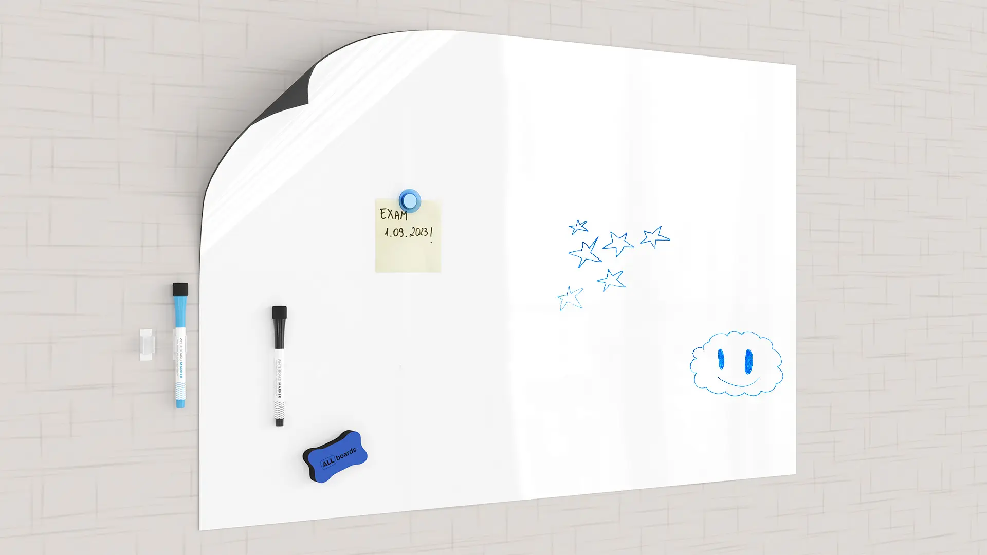 Die selbstklebende trocken abwischbare Magnetauflage von ALLboards lässt sich wie eine superdünne Notiztafel behandeln, die auf der Rückseite mit einer Klebeschicht versehen ist, sodass Sie sie ganz einfach an der gewählten Oberfläche anbringen können – schnell, einfach und ohne Bohren!