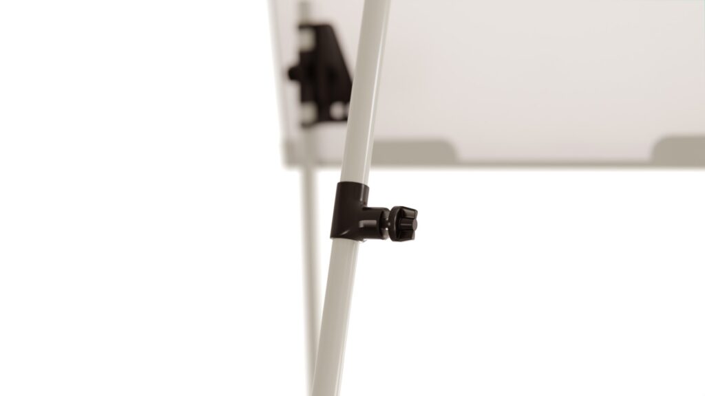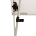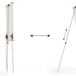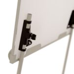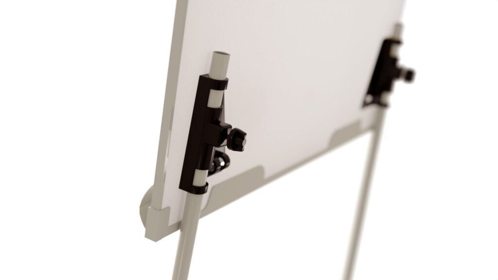 Das dreibeinige Stativ kann zusätzlich stufenlos von 100 cm auf 186 cm in der Höhe verstellt werden. Das Flipchart verfügt zudem über ausschiebbare Papierhaken für alle gängigen Flipchart-Papierblöcke, die einfach in die vorhandene Ausscherung in der Tafel eingeschoben werden und entsprechend der Lochabstände des Papierblocks positioniert sind.