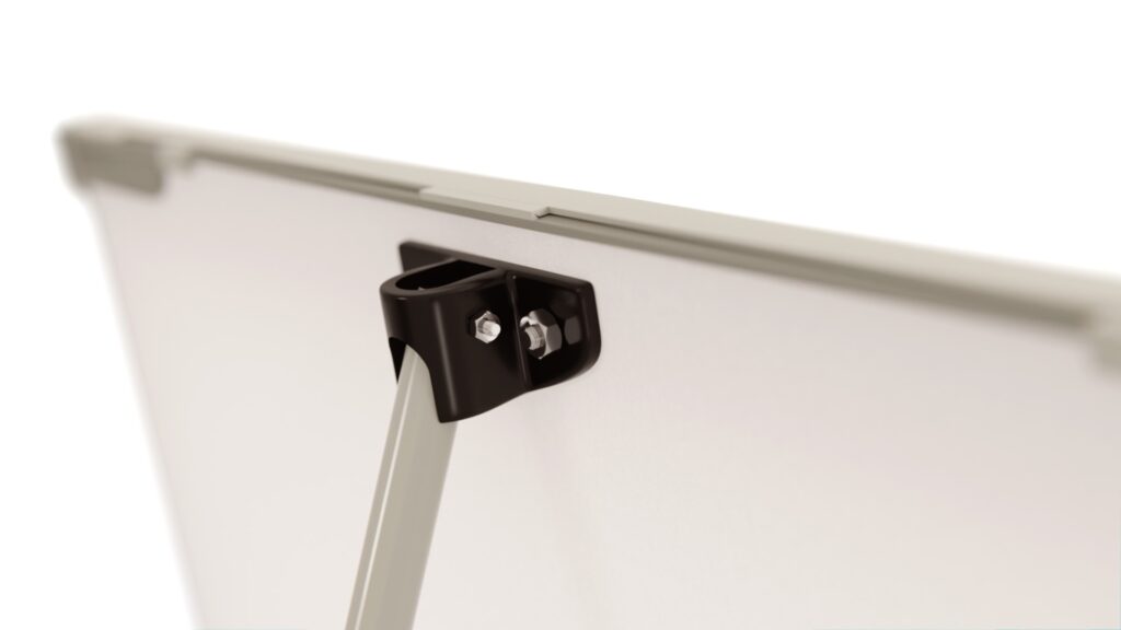 An der Oberseite befindet sich eine aufklappbare Abdeckplatte, welche den Befestigungsmechanismus eines Blocks verdeckt und dem Flipchart ein ästhetisches Aussehen verleiht. Die Abdeckplatte rastet beim Zuklappen ein, damit das angelegte Papier beim Übertragen nicht verrutschen kann.