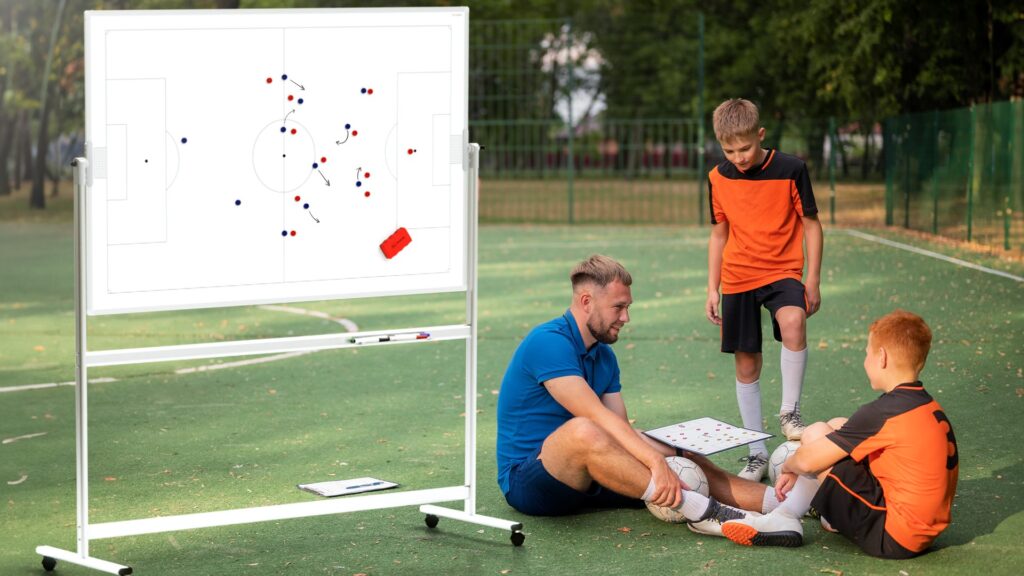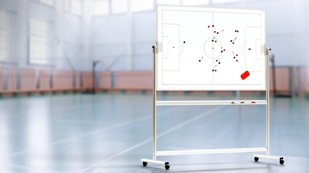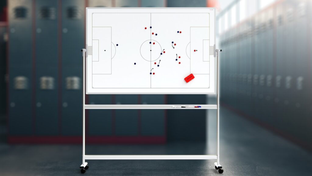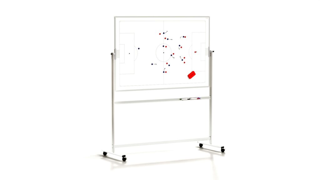 Taktische Tafel FUSSBALL, mobil, doppelseitig, drehbar, trocken abwischbar, magnetisch, 150×100 cm
