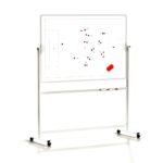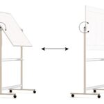 Dank der Alukonstruktion weist die Tafel eine solide Festigkeit auf und kann horizontal um 360 Grad gedreht werden. An einer Seite ist ein drehbarer Handgriff montiert, mit Hilfe dessen die Tafel einfach fixiert und dann beidseitig beschrieben werden kann. Durch die feststellbaren Rollen lässt sich die Drehtafel auf einem solidem Fahrgestell einfach verschieben.