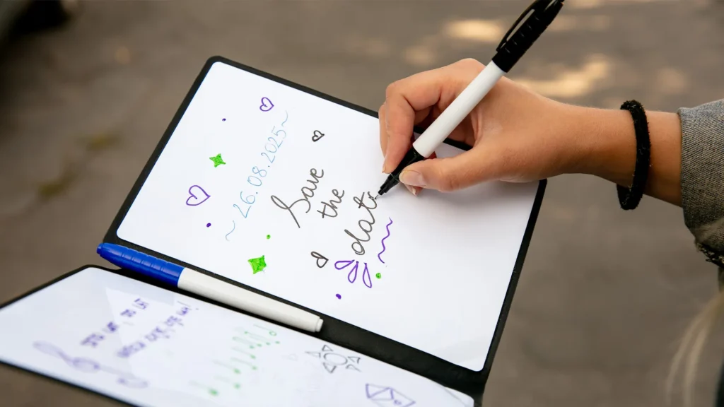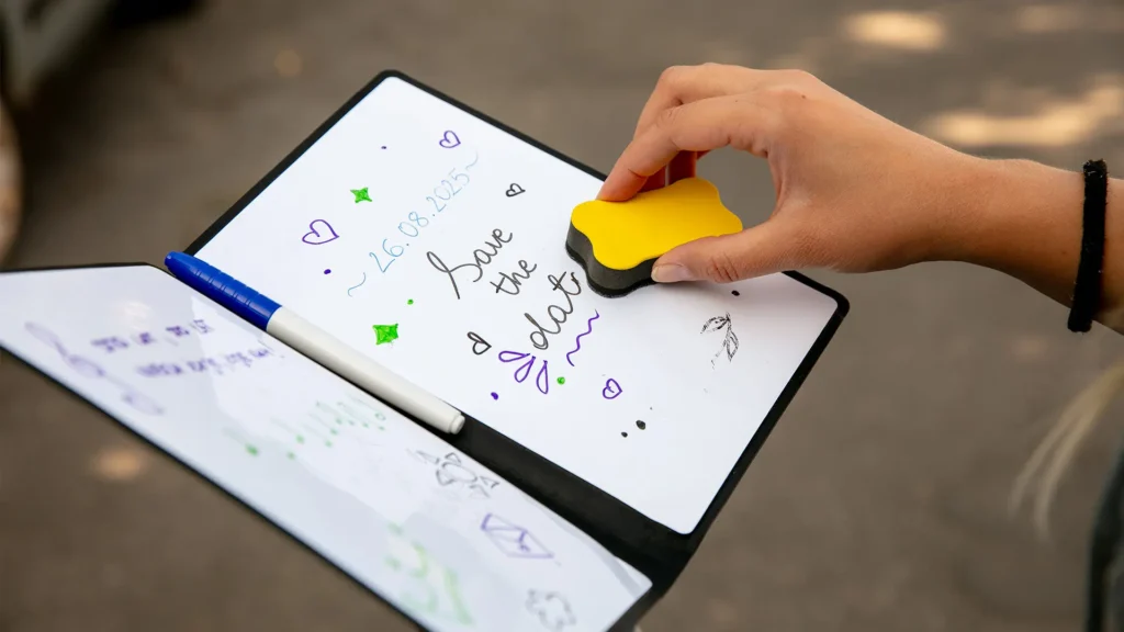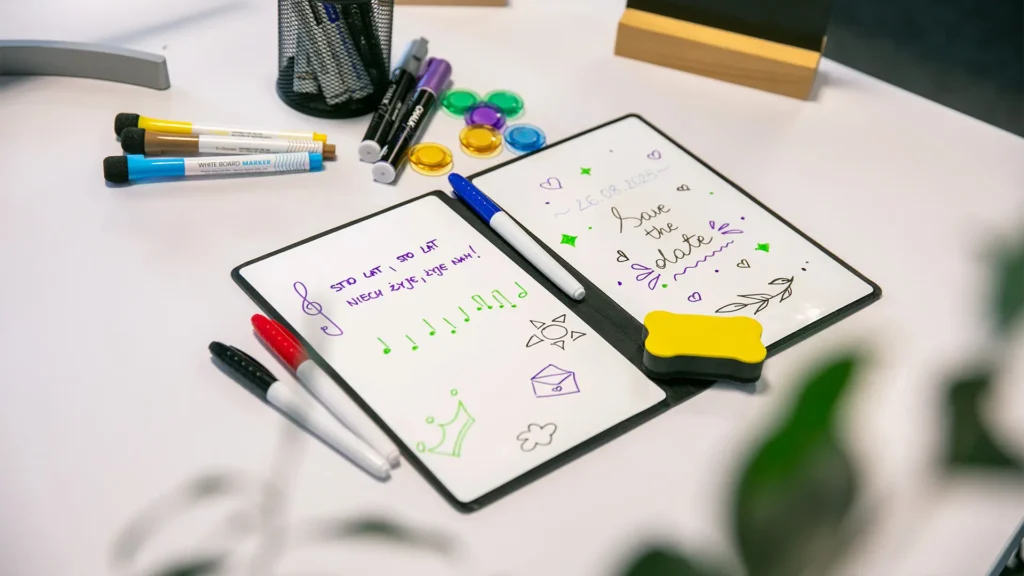 Ersetzen Sie Stapel von Notizen durch eine einzige, stilvolle Lösung! Dieses tragbare A5-Whiteboard ist Ihr persönliches Notizbuch – immer griffbereit, ohne Papier zu verschwenden. Elegant, leicht und in einem praktischen Etui untergebracht, passt es in jede Tasche, jeden Rucksack oder Schreibtisch. Perfekt für Arbeit, Schule, Zuhause und Reisen. Notizen machen, löschen und neu beginnen – ohne Grenzen!
